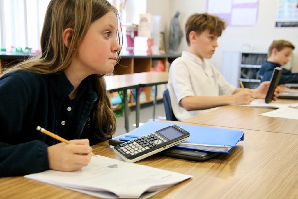 In middle school, our students are placed into a track system based on ability again allowing those who need a challenge an accelerated track while allowing those who need additional help the time and resources. Tracks include: sixth grade Math Expressions supplemented with All Things Algebra, Pre-Algebra and Algebra using the McGraw Hill/Glencoe Math texts supplemented with All Things Algebra and Geometry using the McDougal Larson text supplemented with All Things Algebra. We have a unique partnership with Holy Family Catholic High School to allow our students to take Honors Algebra II and receive high school credit.