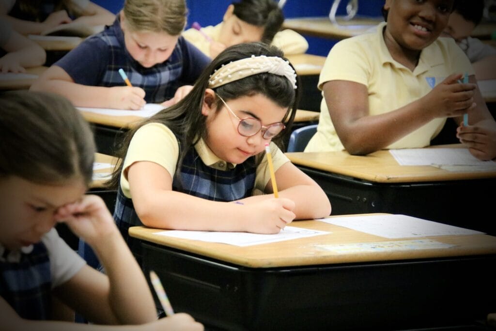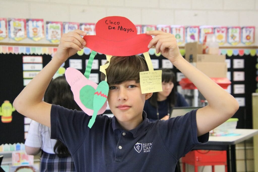 Our students participate in Spanish as one of our specialist classes. We introduce Spanish in Kinderstart, our PK program and then in kindergarten through fourth grades, students begin learning about different cultures, traditions, holidays, basic conversational skills, and vocabulary. Middle school students have Spanish every other day and use the SOMOS curriculum. As students graduate from Notre Dame Academy, our level of instruction has given students an edge as many often test into Spanish Two or Honors Spanish in high school.